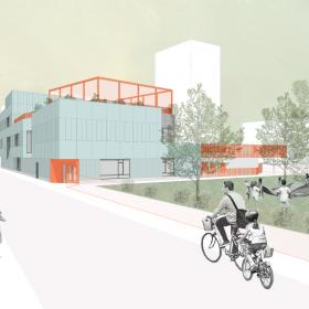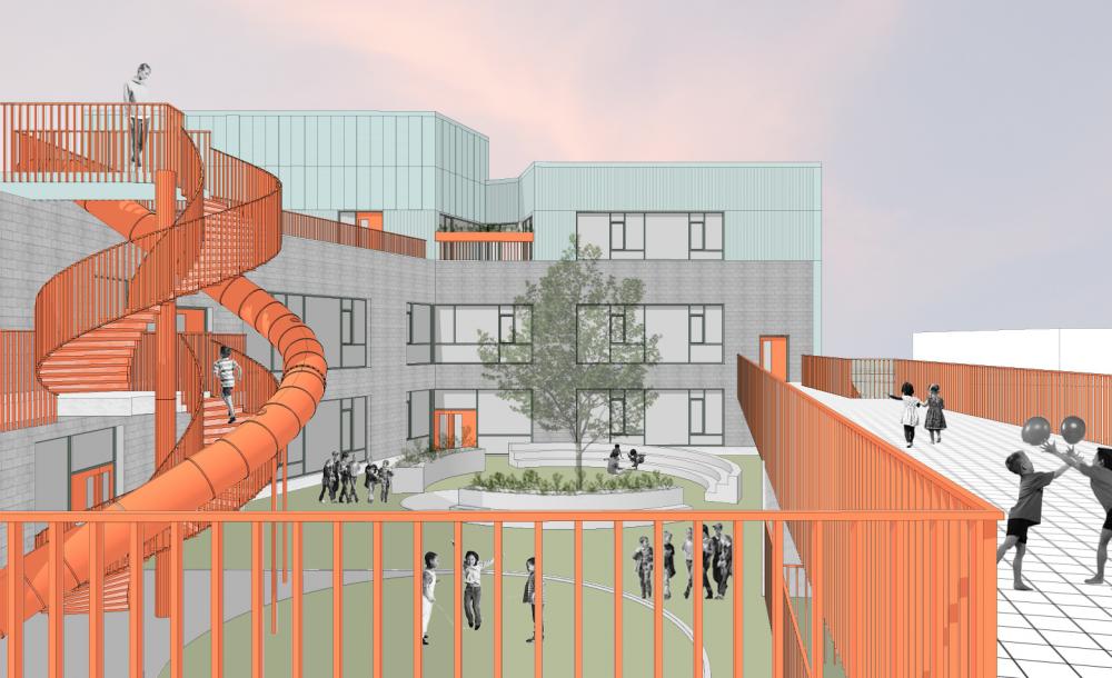 Verder werden een overdekte speelplaats, fietsenstalling en verschillende verbonden open speelplaatsen voorzien.